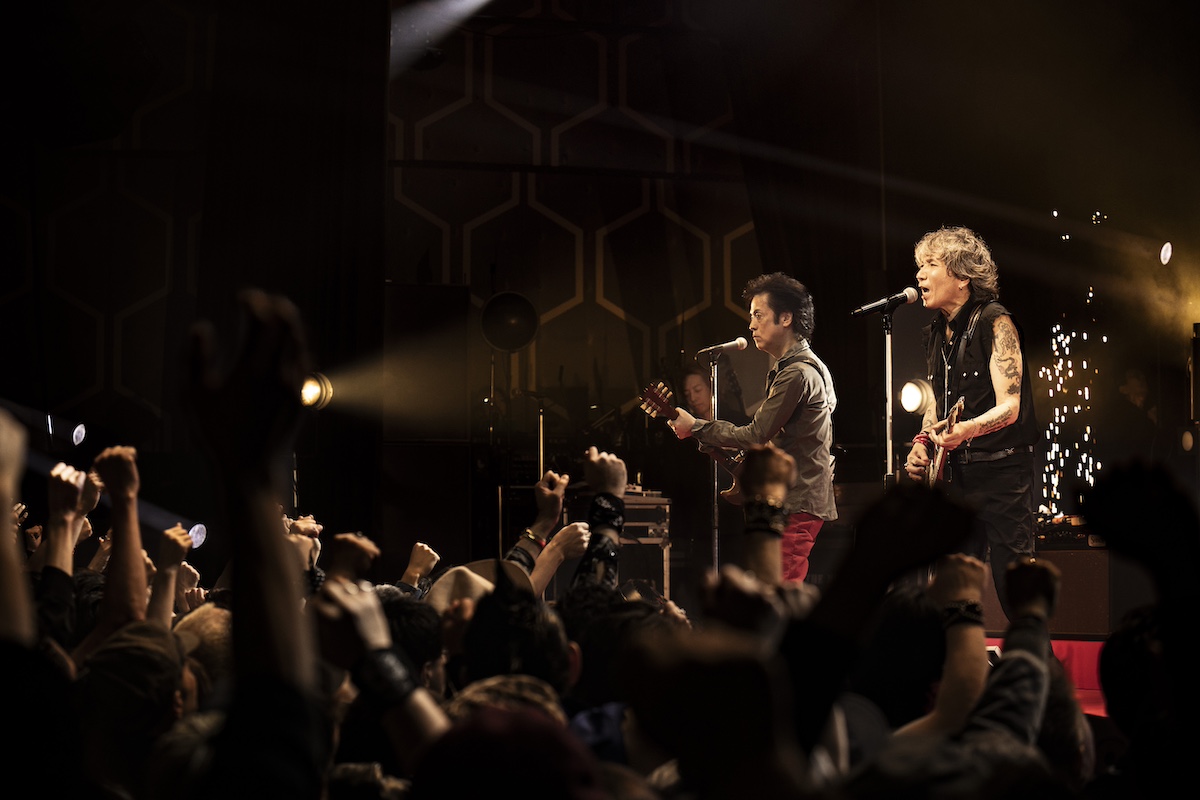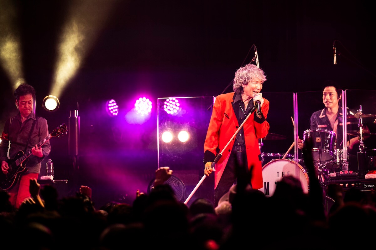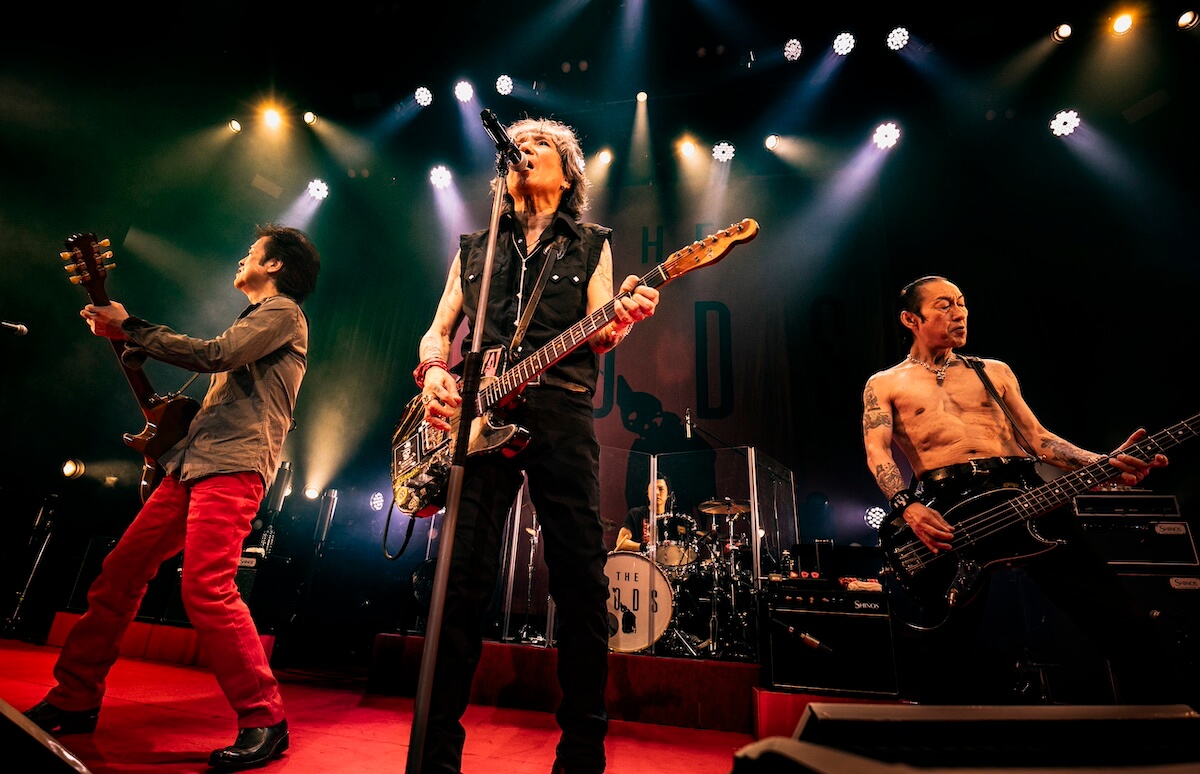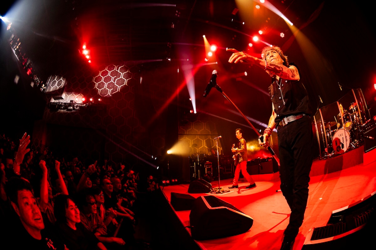 そんな現在地としての“REAL”をデビュー前後のヒリヒリとした“REAL”へと結びつけた『WATCH YOUR STEP』の後、自分たち同様、ファンにもさまざまな事情があることを思いやり、それでも「ロックを楽しんでください」と届けた『TEENAGE BLUE』。<どうせキツイ旅なら楽しめ>(『DRIVE WAY JIVE』)と、同じ空をつないだ苣木の『U.K.FLIGHT 583』で、『SHE’S THE C』、『T-O-K-Y-Oアイランド』、『激しい雨が』…と<転がる音にまたがり時間旅行>(『DRIVE WAY JIVE』)は進んでいく。赤ジャケ着用のジョーカータイムではトランプをバラ撒き(『TRUMP』)、『GO-STOP BOOGIE』では華麗なるダンスまで披露した森山。「いやー、ちょっとやりすぎた(苦笑)」と言いつつも「やっぱり、“立ち”(のライヴ)が楽しいねぇ」と満面の笑み。その後、しっとりとした『ロメオとジュリエット』を挟み、北里の『POGO DANCING』が炸裂すれば、『ゴキゲンRADIO』、『TOMORROW NEVER COMES』とボルテージは上がったままで本編は終了した。