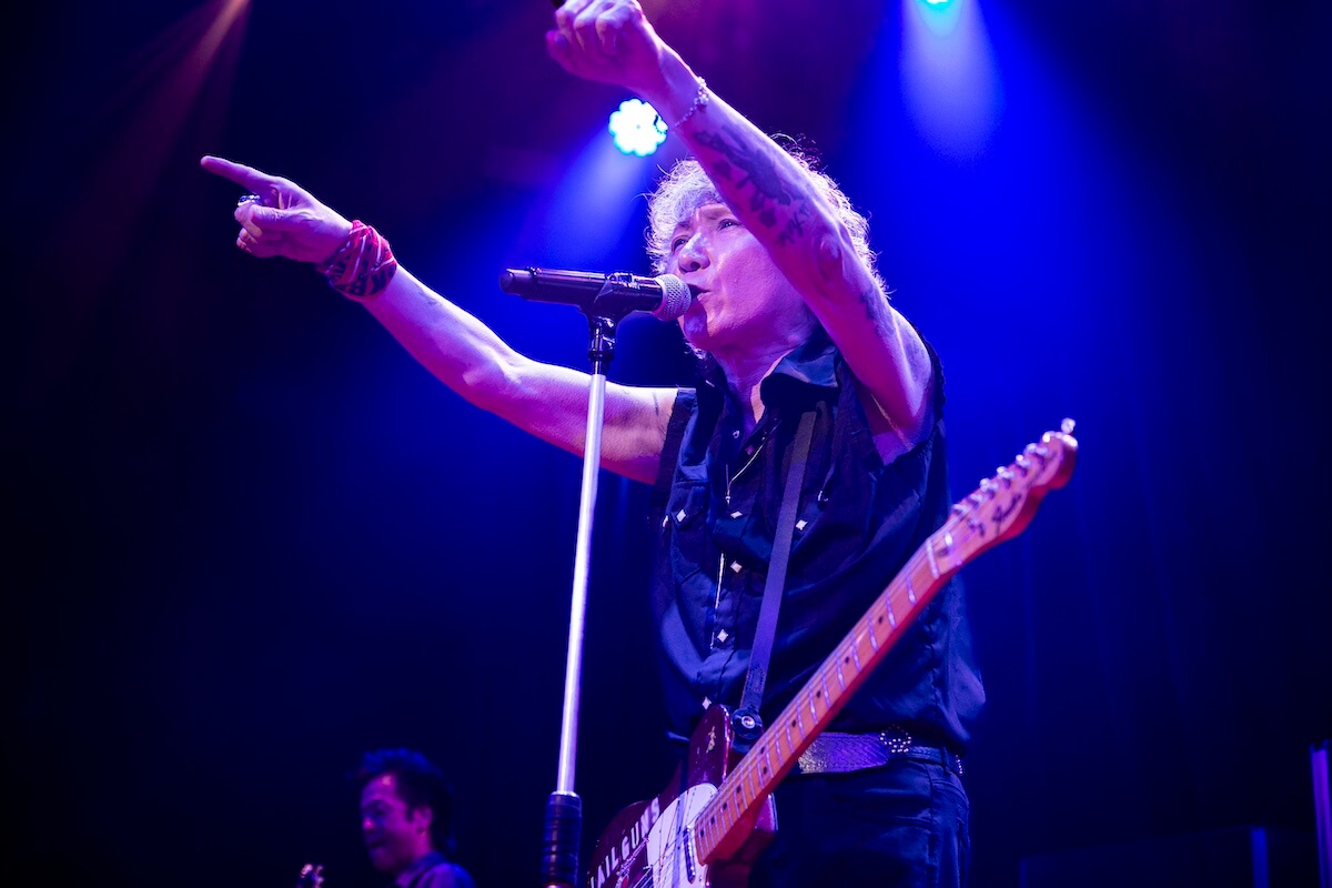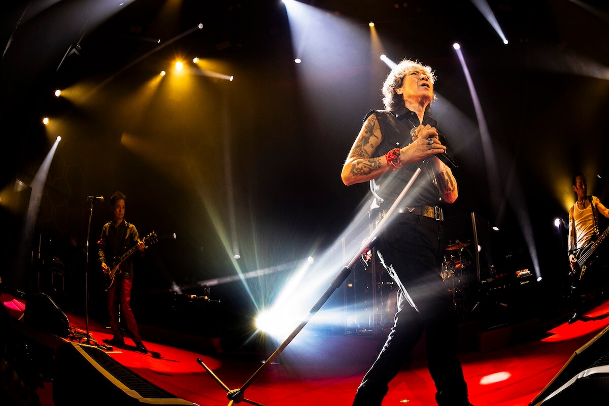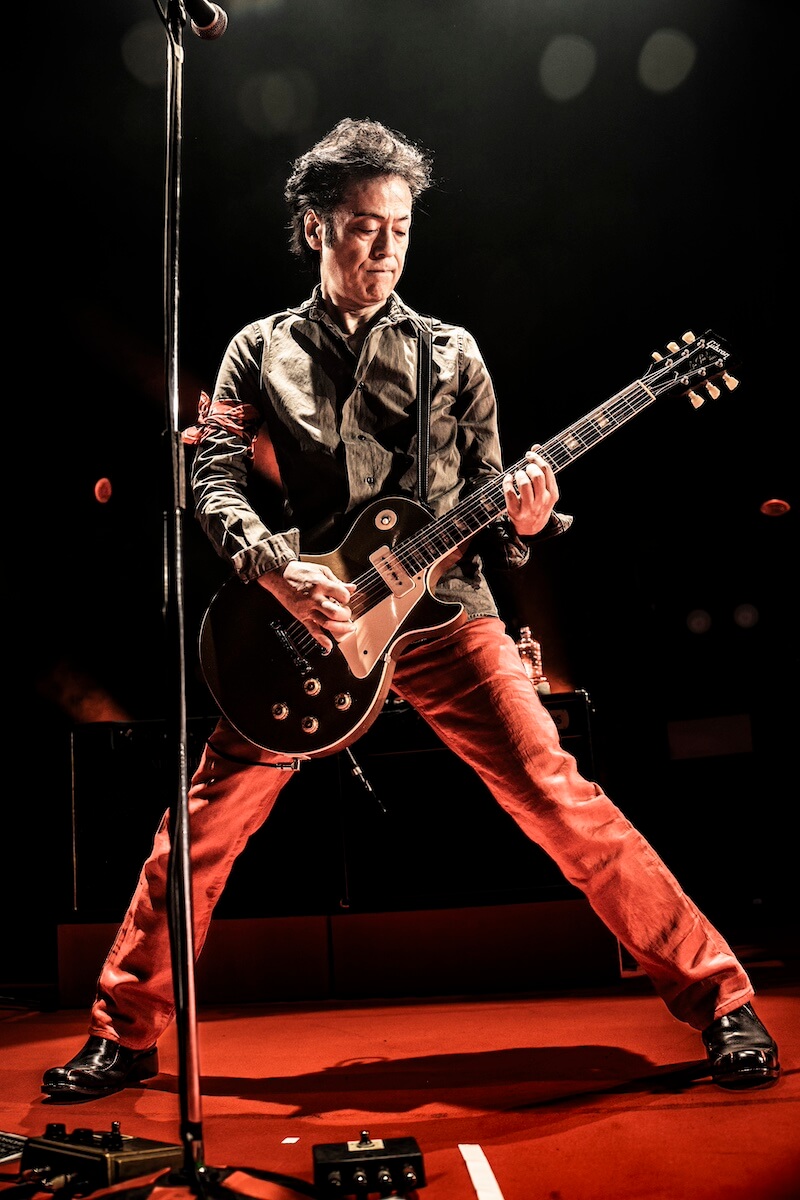そんな現在地としての“REAL”をデビュー前後のヒリヒリとした“REAL”へと結びつけた『WATCH YOUR STEP』の後、自分たち同様、ファンにもさまざまな事情があることを思いやり、それでも「ロックを楽しんでください」と届けた『TEENAGE BLUE』。<どうせキツイ旅なら楽しめ>(『DRIVE WAY JIVE』)と、同じ空をつないだ苣木の『U.K.FLIGHT 583』で、『SHE’S THE C』、『T-O-K-Y-Oアイランド』、『激しい雨が』…と<転がる音にまたがり時間旅行>(『DRIVE WAY JIVE』)は進んでいく。赤ジャケ着用のジョーカータイムではトランプをバラ撒き(『TRUMP』)、『GO-STOP BOOGIE』では華麗なるダンスまで披露した森山。「いやー、ちょっとやりすぎた(苦笑)」と言いつつも「やっぱり、“立ち”(のライヴ)が楽しいねぇ」と満面の笑み。その後、しっとりとした『ロメオとジュリエット』を挟み、北里の『POGO DANCING』が炸裂すれば、『ゴキゲンRADIO』、『TOMORROW NEVER COMES』とボルテージは上がったままで本編は終了した。